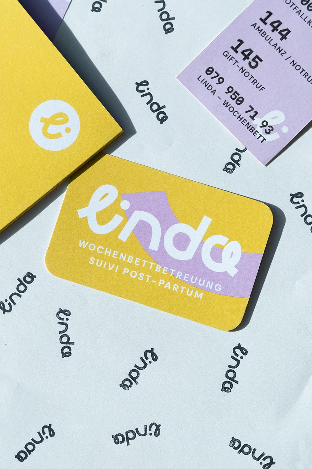 Linda lebt für ihren Beruf der Wochenbettbetreuung und steht als Person im Zentrum der visuellen Identität. Möglichst authentisch und «immer erreichbar» positioniert sie das Branding. Das Logo als eigens entworfener Schriftzug steht für die Nahbarkeit, Herzlichkeit und Geborgenheit, die sie für ihre Patientinnen und Patienten schafft.